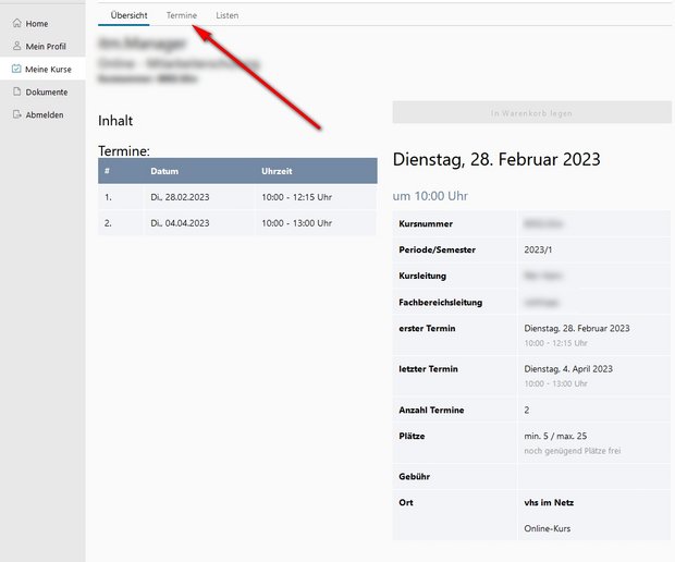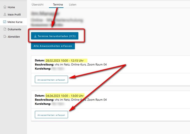 - Über Register "Termine" (s. Bild oben) landen Sie auf der Seite, auf der Sie die Kurstermine für Ihren Kalender herunterladen können (in ICS-Format).