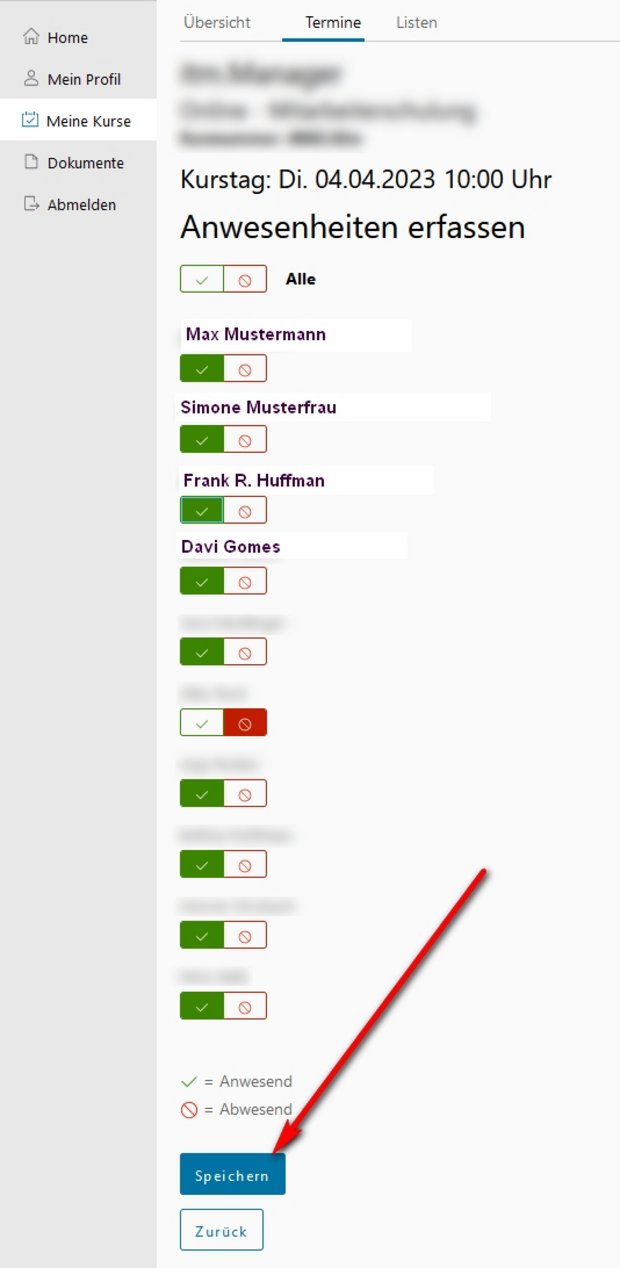 - Im Register "Termine" können Sie auch die Anwesenheiten online erfassen: